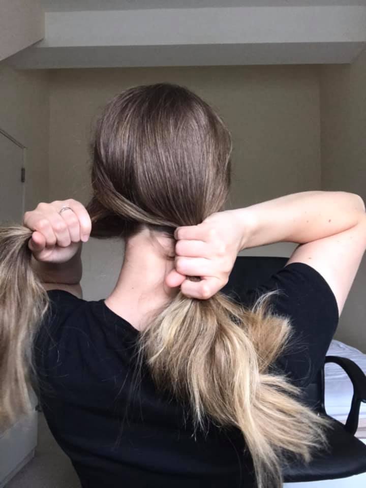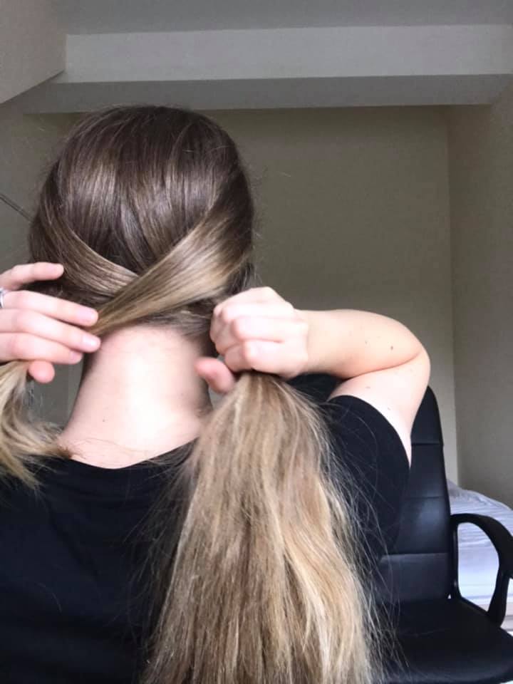 Pridizite jednom rukom obadva razijeljena pramena tako da si kaziprstom pomognete i dalje ih drzati razdvojenima (u jednoj ruci). A ako ste spretniji ili imate duzu kosu mozete kao ja samo jedan pramen pridrzati a drugi s kojeg cete uzimati pramencice ostaviti raspustenim (kao sa slike).