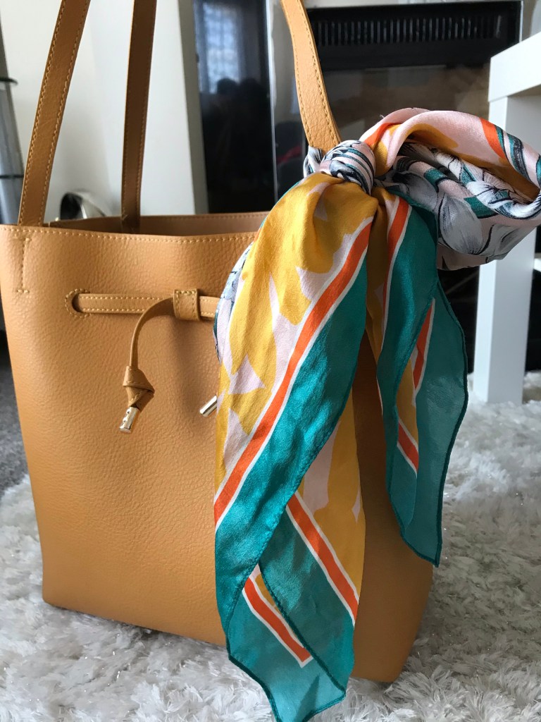 Moje sve marame su rendom (uglavnom s Wisha) . Ali ako imate nekakvu kvalitetniju ili svilenu s bojama koje se uklapaju uz boju vase torbe biti ce puno ljepse.